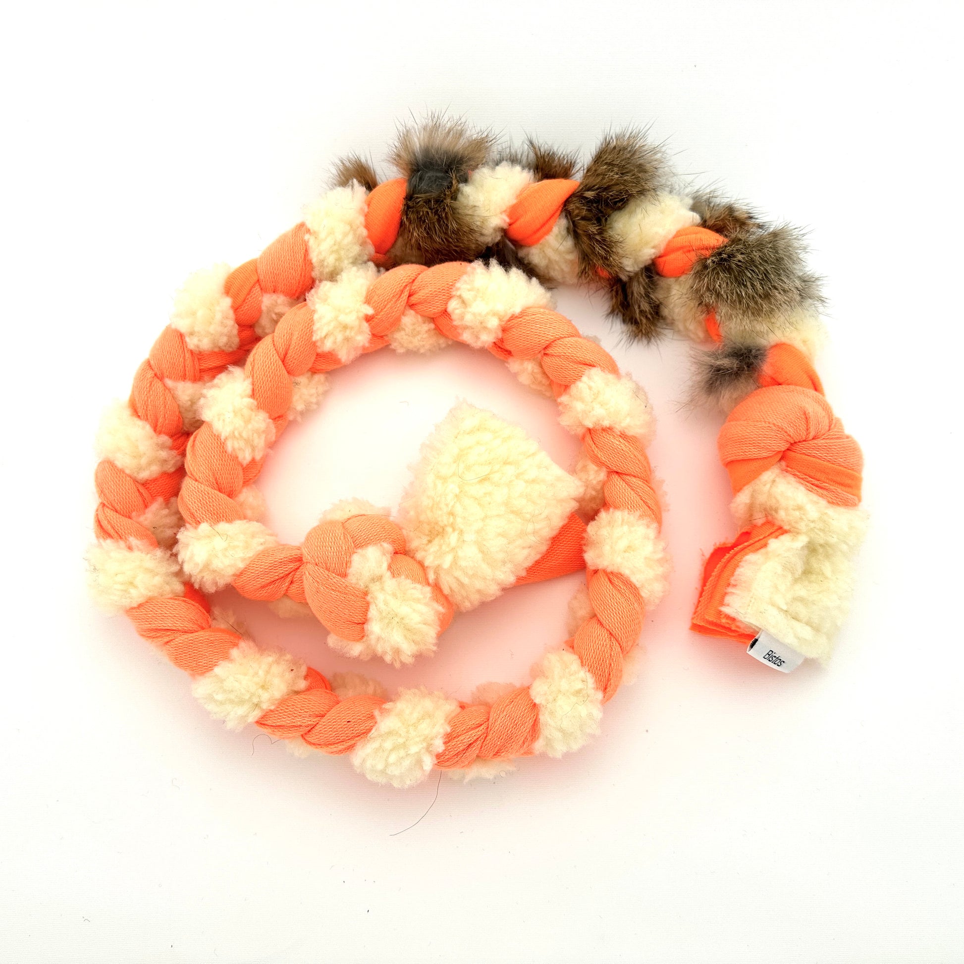 Denna extra långa kampfläta är handgjord i Borås av Bistos och kombinerar slitstark flätning med lockande äkta kaninskinn - perfekt för interaktiv lek, belöning och dragövningar. Med en längd på cirka 130 cm ger den gott om utrymme för fartfyllda lekar och lekfull kamp, även med större hundar eller när du vill hålla lite avstånd.