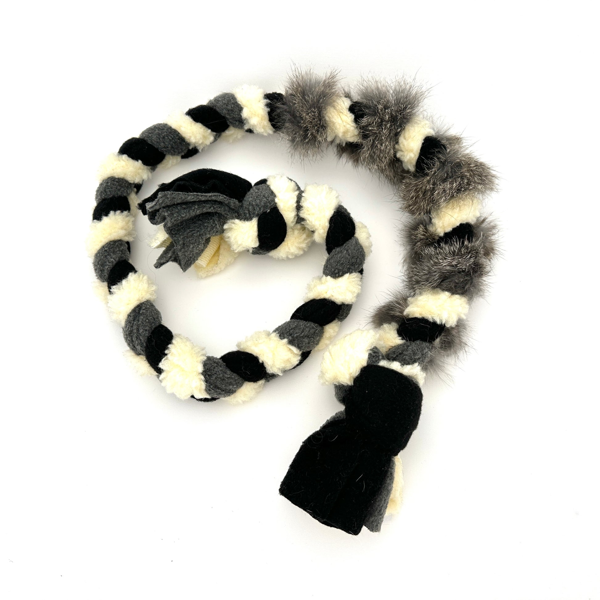 Flätan är tillverkad i robust fleece, med insyddt kaninskinn som ger både doft, textur och naturlig motivation. Kaninskinnet är placerat en bit in från ena änden för bättre balans mellan grepp för dig och motivation för hunden. Välj mellan färgkombinationerna svartgrå/vit, röd/vit eller aprikos/vit.