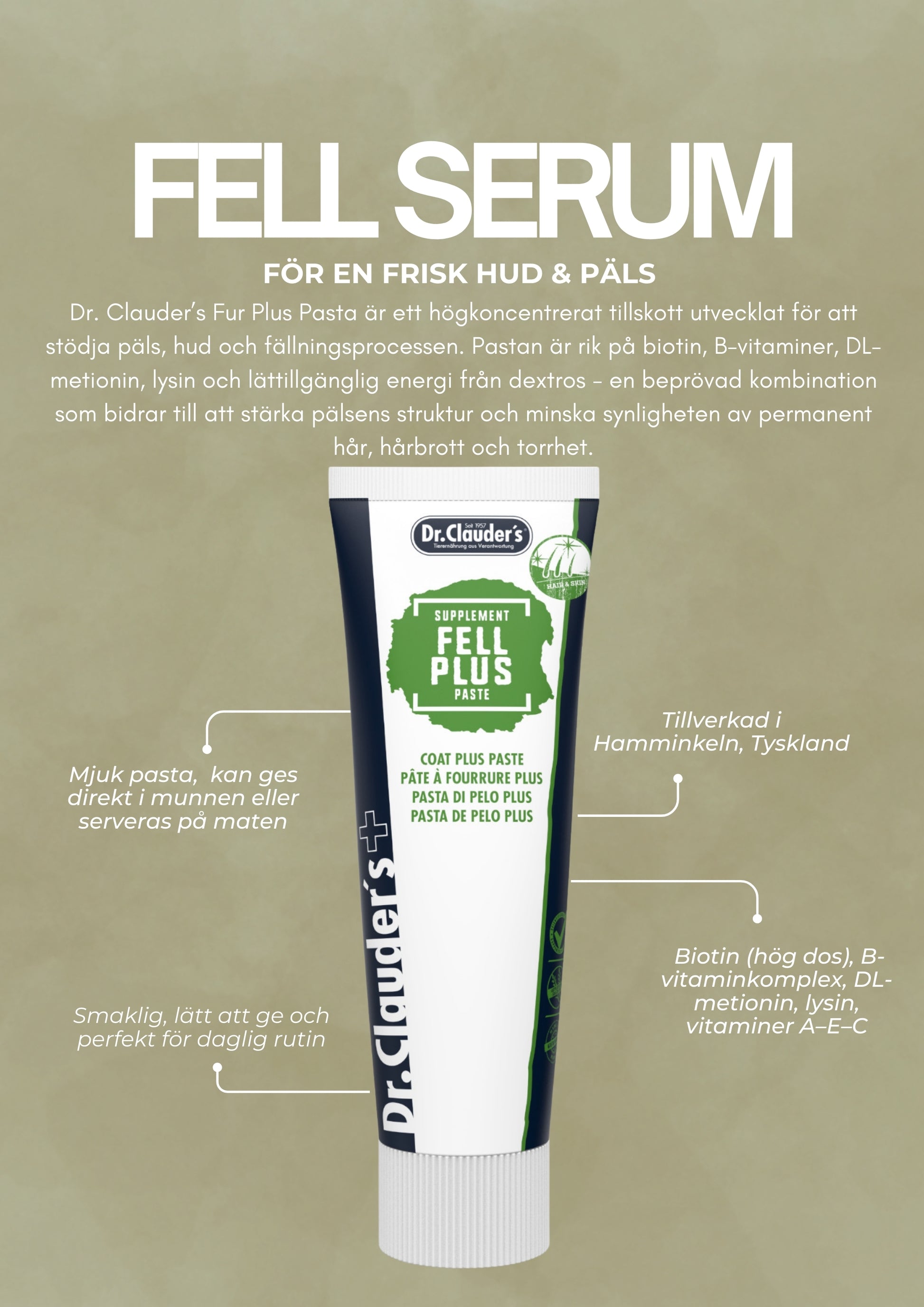 Dr. Clauder’s Fur Plus Pasta är ett högkoncentrerat tillskott utvecklat för att stödja päls, hud och fällningsprocessen hos både hundar och katter. Pastan är rik på biotin, B-vitaminer, DL-metionin, lysin och lättillgänglig energi från dextros - en beprövad kombination som bidrar till att stärka pälsens struktur och minska synligheten av permanent hår, hårbrott och torrhet.