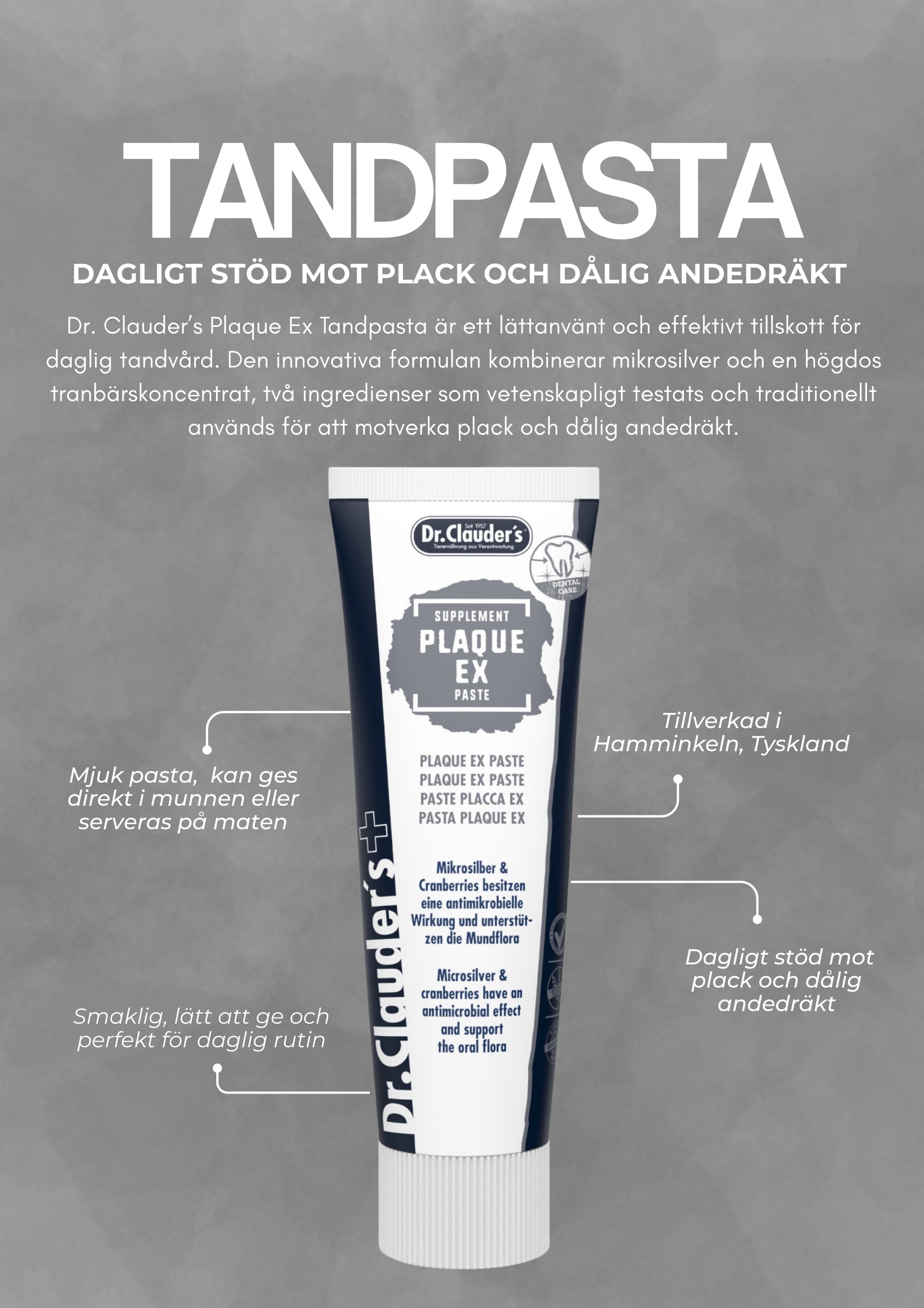 Dr. Clauder’s Plaque Ex Tandpasta är ett lättanvänt och effektivt tillskott för daglig tandvård hos hundar och katter. Den innovativa formulan kombinerar mikrosilver och en högdos tranbärskoncentrat, två ingredienser som vetenskapligt testats och traditionellt används för att motverka plack och dålig andedräkt. Mikrosilvret lägger sig som en långvarig skyddsbarriär i munnen och hjälper till att hämma bakterier och svampar, medan tranbärsextraktet gör det svårare för plack att fästa på tänderna.