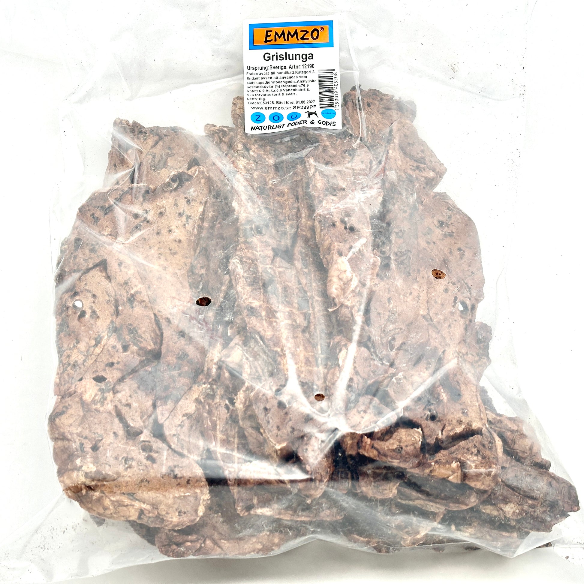 Emmzos grislunga är ett naturligt hundgodis tillverkat av 100% svensk råvara. Lungan är varsamt torkad för att bevara smak och näring, och resultatet blir lätta och luftiga bitar som hundar i alla åldrar uppskattar.