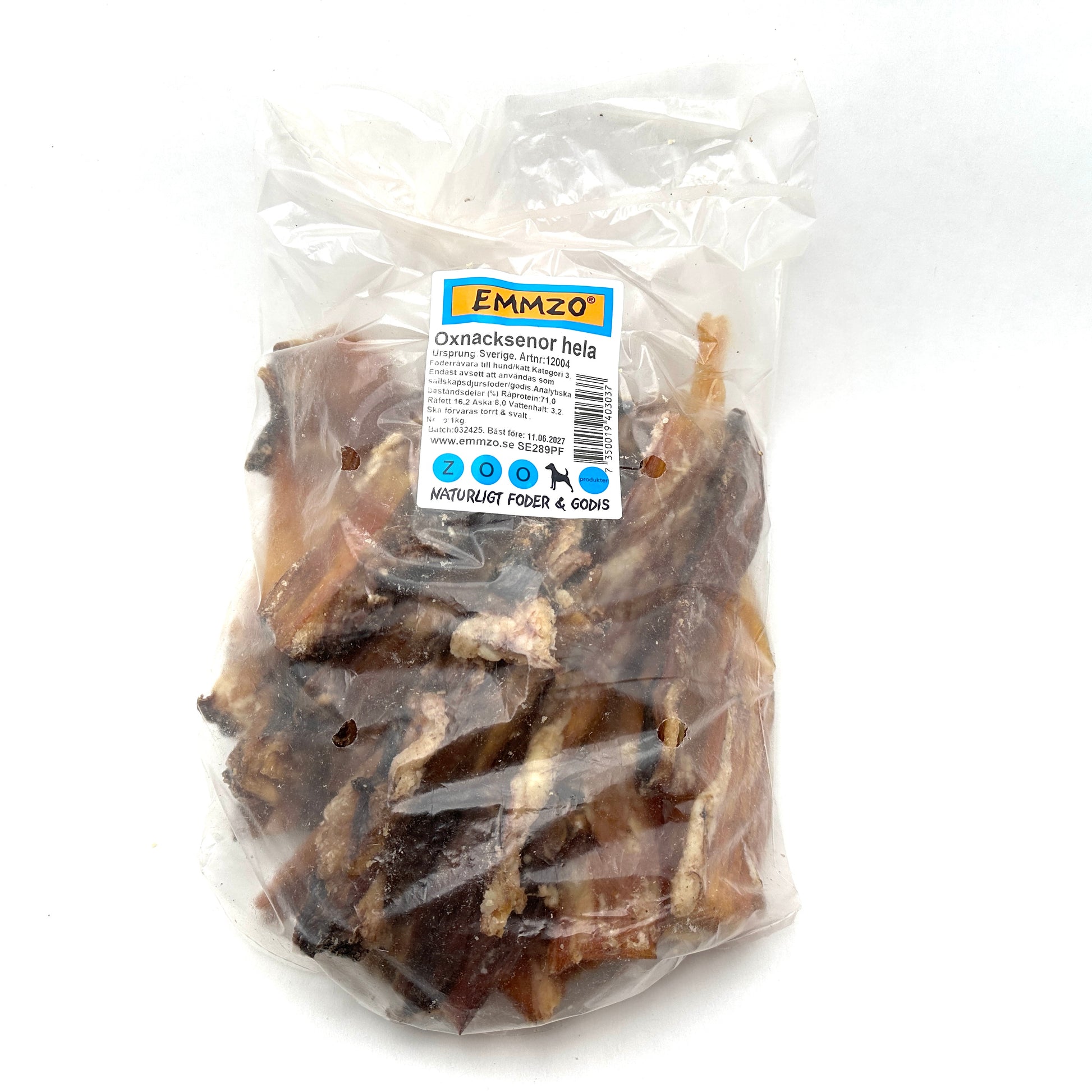 Emmzos svenska oxnacksena är ett naturligt tugg från 100% svenskt nötdjur. Varje sena är cirka 18-30 cm lång, men eftersom det är ett naturtugg kan storlek och form variera. Konsistensen är seg, halvhård och lite krispig - vilket ger ett tugg som varar en stund utan att bli för hårt.