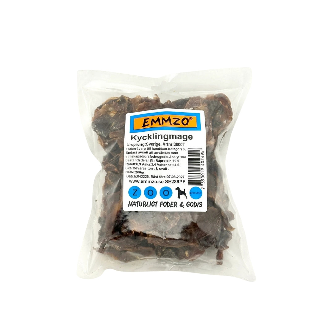 Emmzos kycklingmage är ett smakrikt hundgodis tillverkat av 100% svensk kyckling. Bitarna är varsamt torkade för att bevara både smak och näring, vilket gör dem sega med en liten knaprighet som hundar gillar.