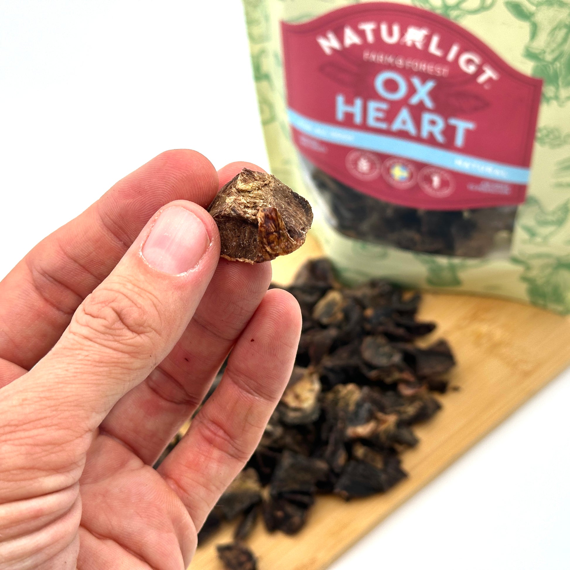 Farm & Forests torkade oxhjärta är ett naturligt och näringsrikt hundgodis tillverkat av 100% svenska råvaror. Hjärtat skärs i bitar och torkas varsamt vid låg temperatur i Landskrona för att bevara smak, konsistens och näringsämnen. Resultatet är ett krispigt godis som passar perfekt som belöning.