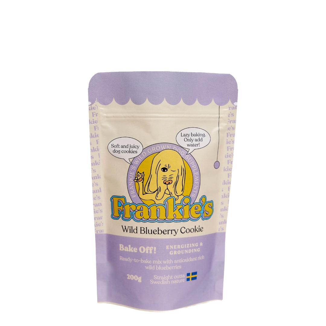 Frankie’s Wild Blueberry Cookie är en naturlig cookie-mix för hundar som gör det enkelt att baka egna hundkakor hemma. Mixen är framtagen med fokus på råvaror med högt näringsinnehåll och består främst av svenska ingredienser, kompletterade med utvalda råvaror från EU. Resultatet blir mjuka, smakrika kakor som passar perfekt som belöning eller ett gott inslag i vardagen.
