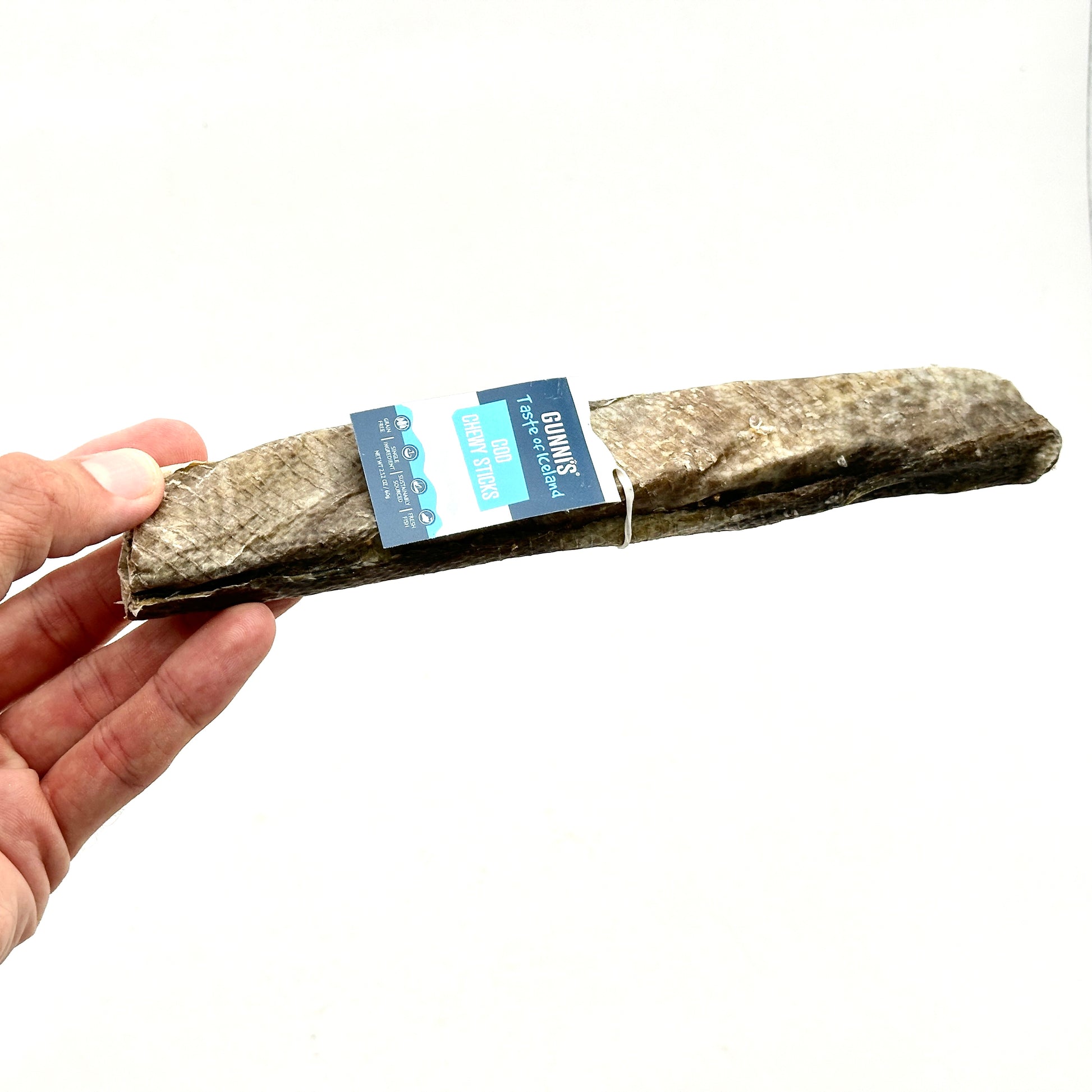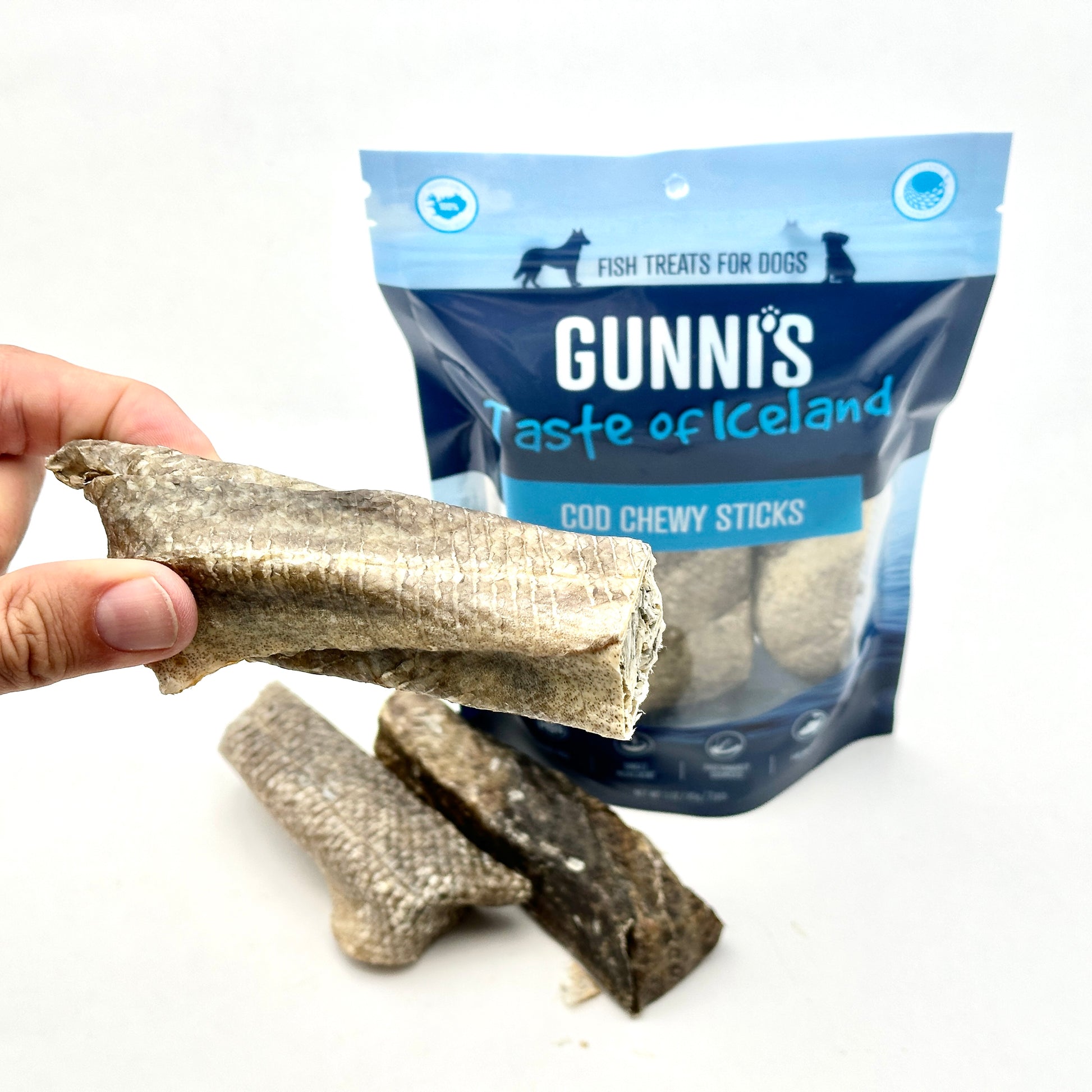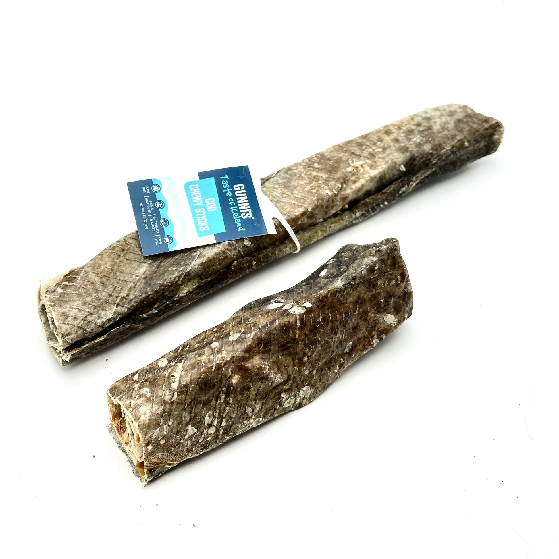 Cod Chewy Sticks från Gunnis är naturliga tugg tillverkade av 100% torsk - lufttorkade på Island utan tillsatser, spannmål eller konserveringsmedel. Doften är tydlig och lockande, och konsistensen är seg och något mjukare än traditionella hårda tugg, vilket gör dem tillgängliga för många hundar som uppskattar ett lättare fiskbaserat tugg.