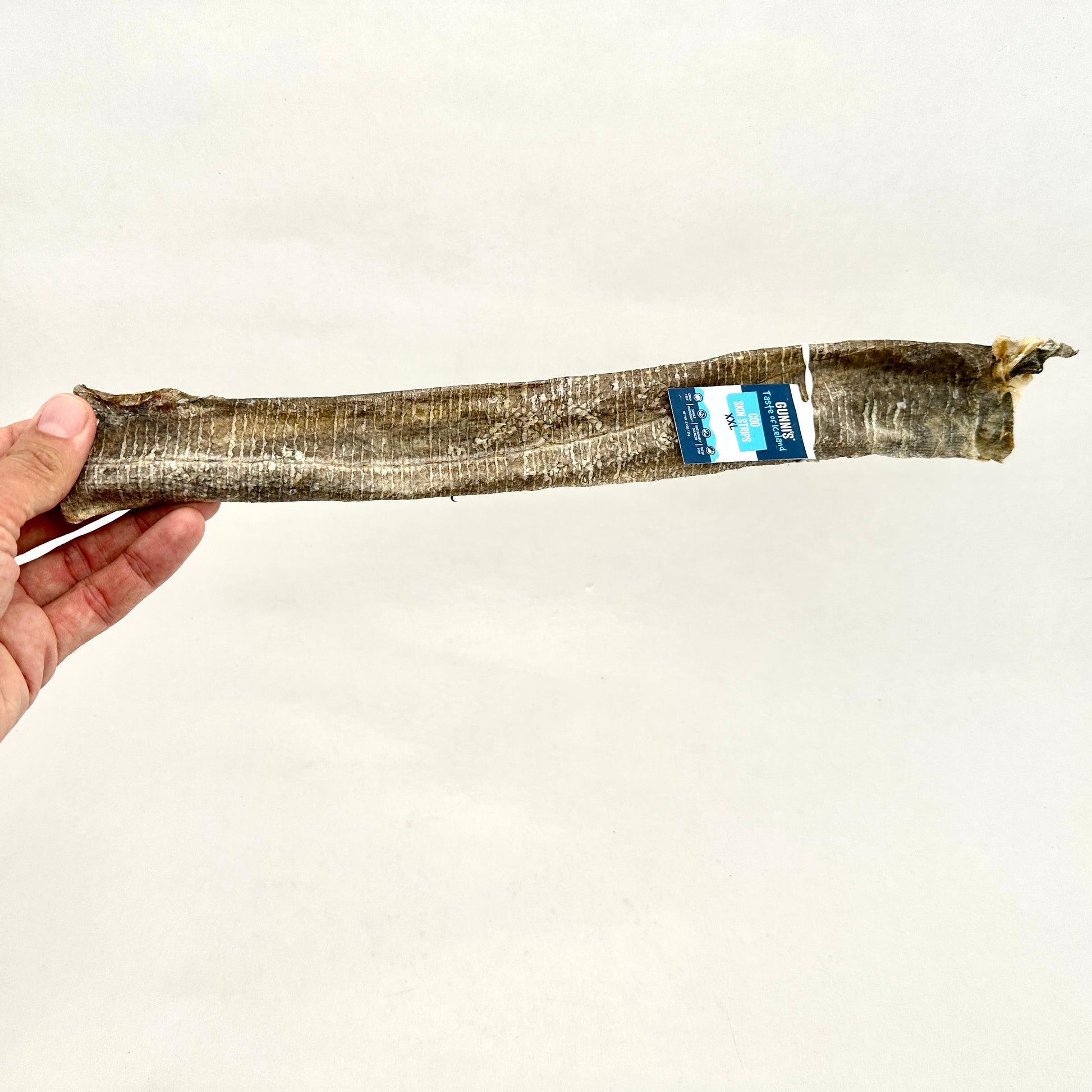 Cod Skin Chewy Strips från Gunnis är lufttorkade tugg tillverkade av 100% torsk - helt utan tillsatser, spannmål eller konserveringsmedel. Stripsen har en tydlig fiskdoft och ett lätt segt tuggmotstånd som gör dem till ett snabbt och smakrikt mellantugg, särskilt för mellanstora till stora hundar.