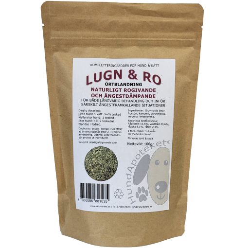 Lugn & Ro är ett naturligt fodertillskott och har inga medicinska effekter. Det kan inte ersätta veterinärvård vid sjukdom. Örter verkar långsamt - räkna med 2–3 veckor innan full effekt. Produkten är inte testad på dräktiga eller digivande tikar och bör inte ges utan veterinärens godkännande. Förvaras torrt och svalt.