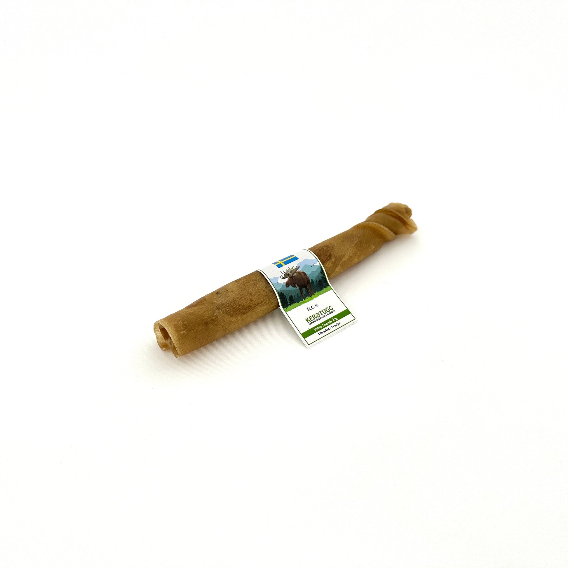 Kerotuggs älgrulle är ett smakrikt och hållbart tugg, tillverkat av 100% älghud - helt utan tillsatser, blekmedel eller konstgjorda ämnen. Älg är en av de segare råhudstyperna, vilket ger ett högt tuggmotstånd och håller din hund sysselsatt länge. Tack vare sin låga fetthalt och naturliga innehåll är älgrullen också snäll mot känsliga magar.