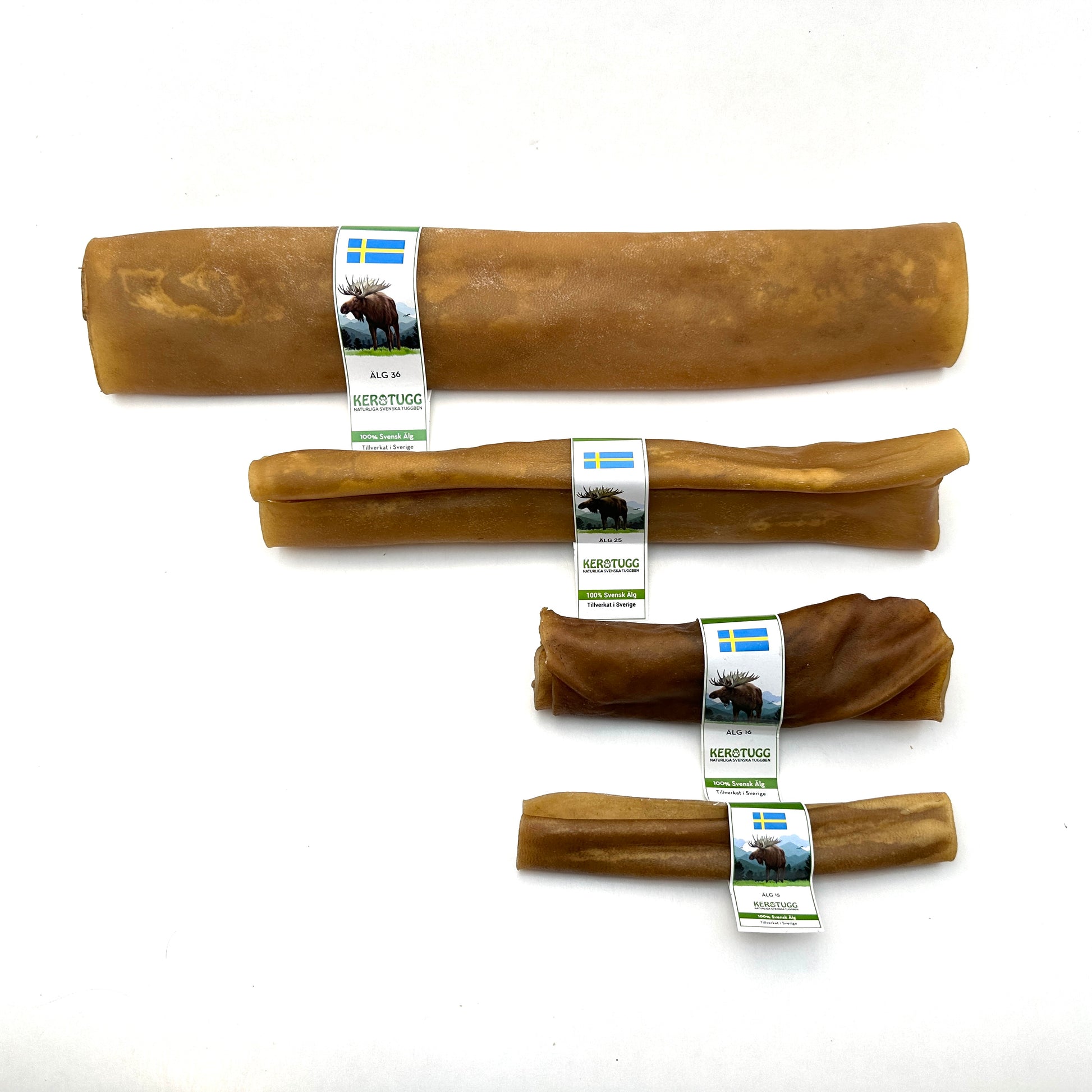Kerotuggs älgrullar rullas för hand i Norrbotten, vilket gör varje rulle unik i både längd och vikt. Älgskinnets sega konsistens hjälper till att avlägsna plack och tandsten, vilket främjar din hunds munhälsa.