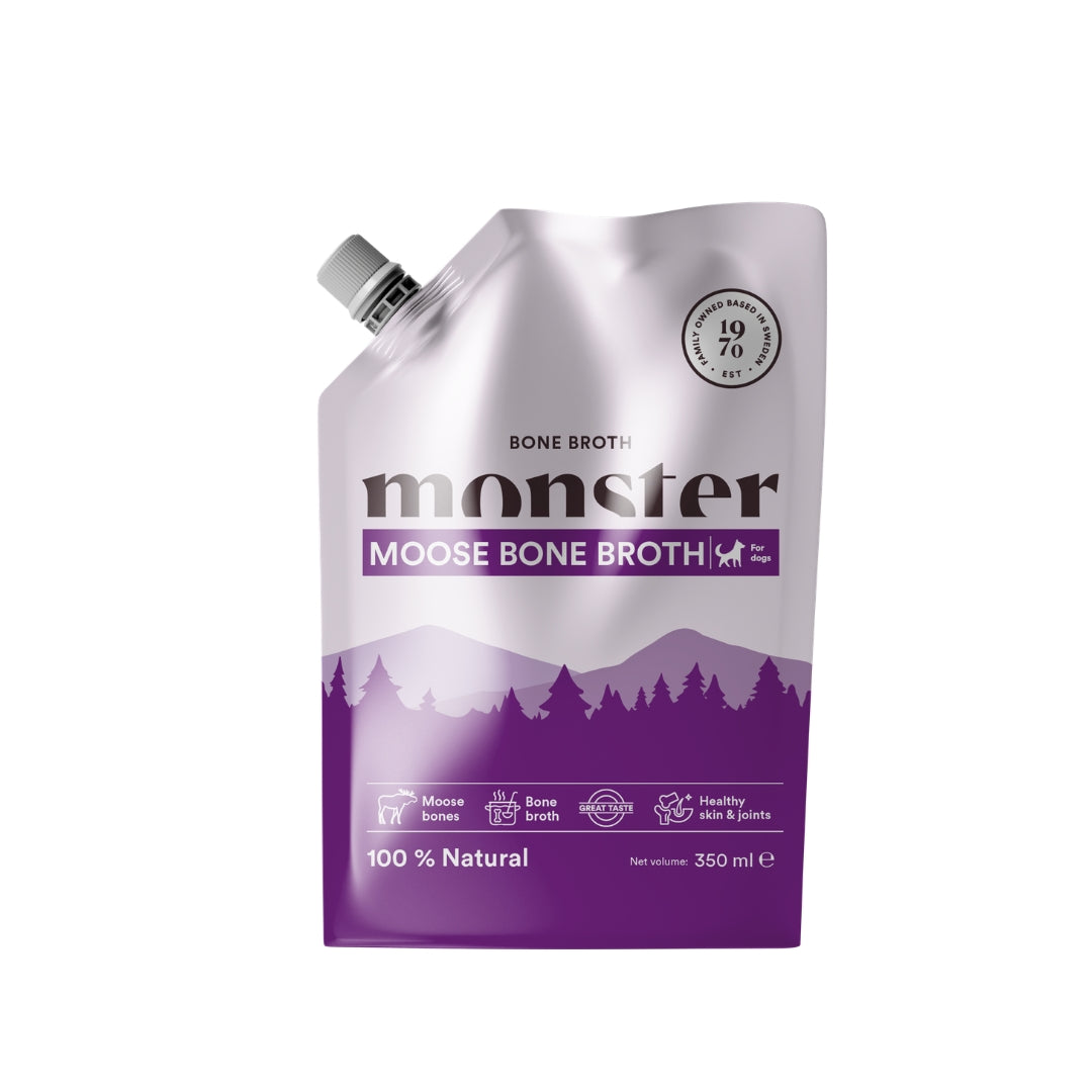 Monster Benbuljong Älg är en naturlig och smakrik topping som hjälper till att öka vätskeintaget och ge extra smak i matskålen. Med älgben som bas och naturligt kollagen är den ett enkelt sätt att stötta leder, hud och päls i vardagen.