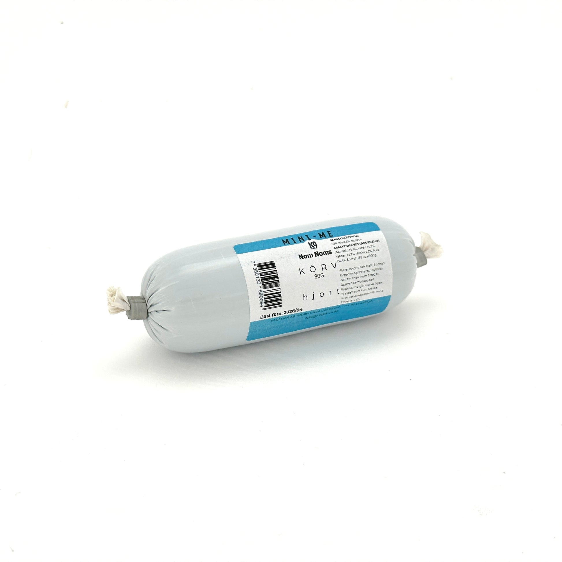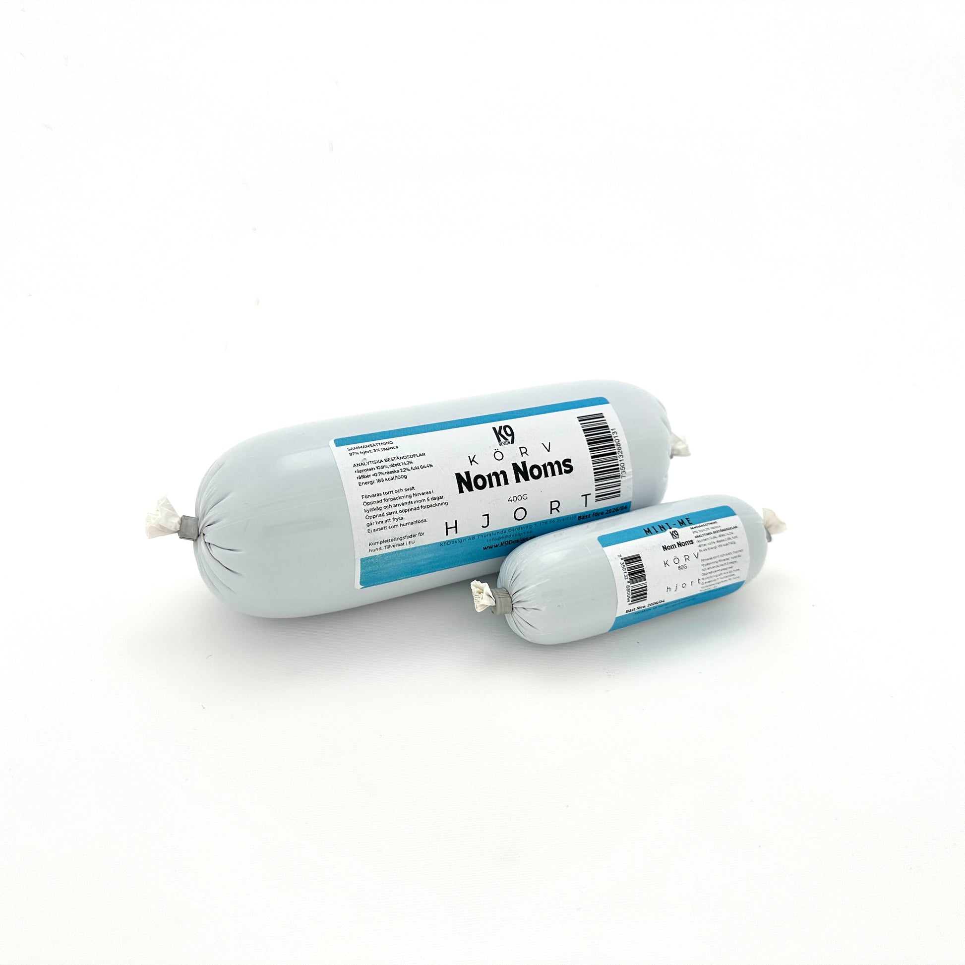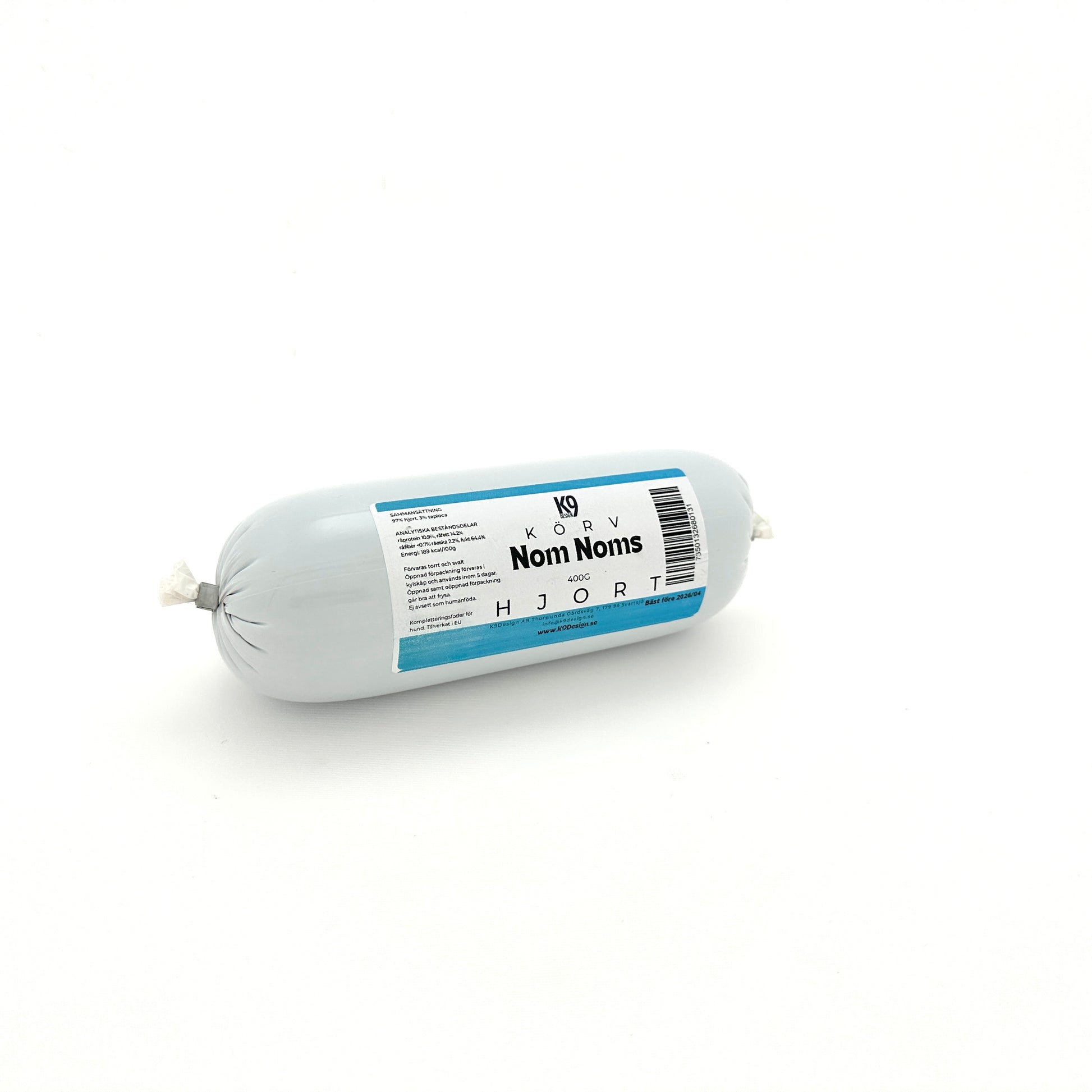Nom Noms KÖRV av hjortkött är ett mjukt och formbart hundgodis tillverkat av 97% hjortkött och 3% tapioka - ett skonsamt singelprotein som passar perfekt för känsliga magar. Den säljs i 80 g eller 400 g korv som du själv skär upp i lagom stora bitar beroende på hund och användningsområde.
