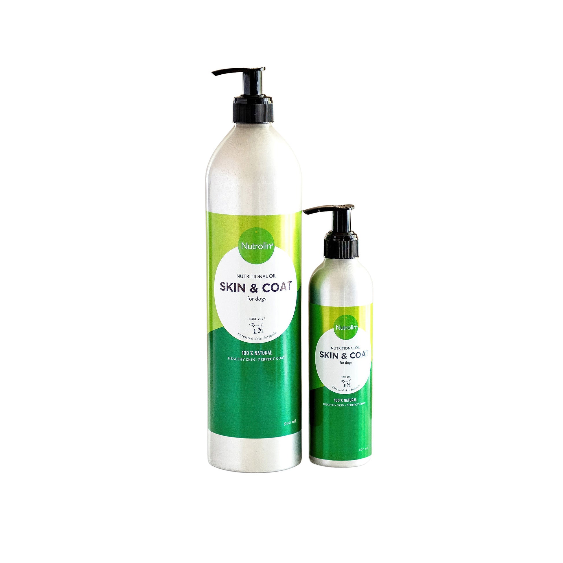 Nutrolin Skin & Coat är en patenterad näringsolja baserad på kallpressade vegetabiliska oljor, särskilt framtagen för att stödja hudens och pälsens funktion hos hundar i alla åldrar. Oljan innehåller höga halter linolsyra, en essentiell omega-6-fettsyra som är avgörande för hudens fuktbalans och barriärfunktion.