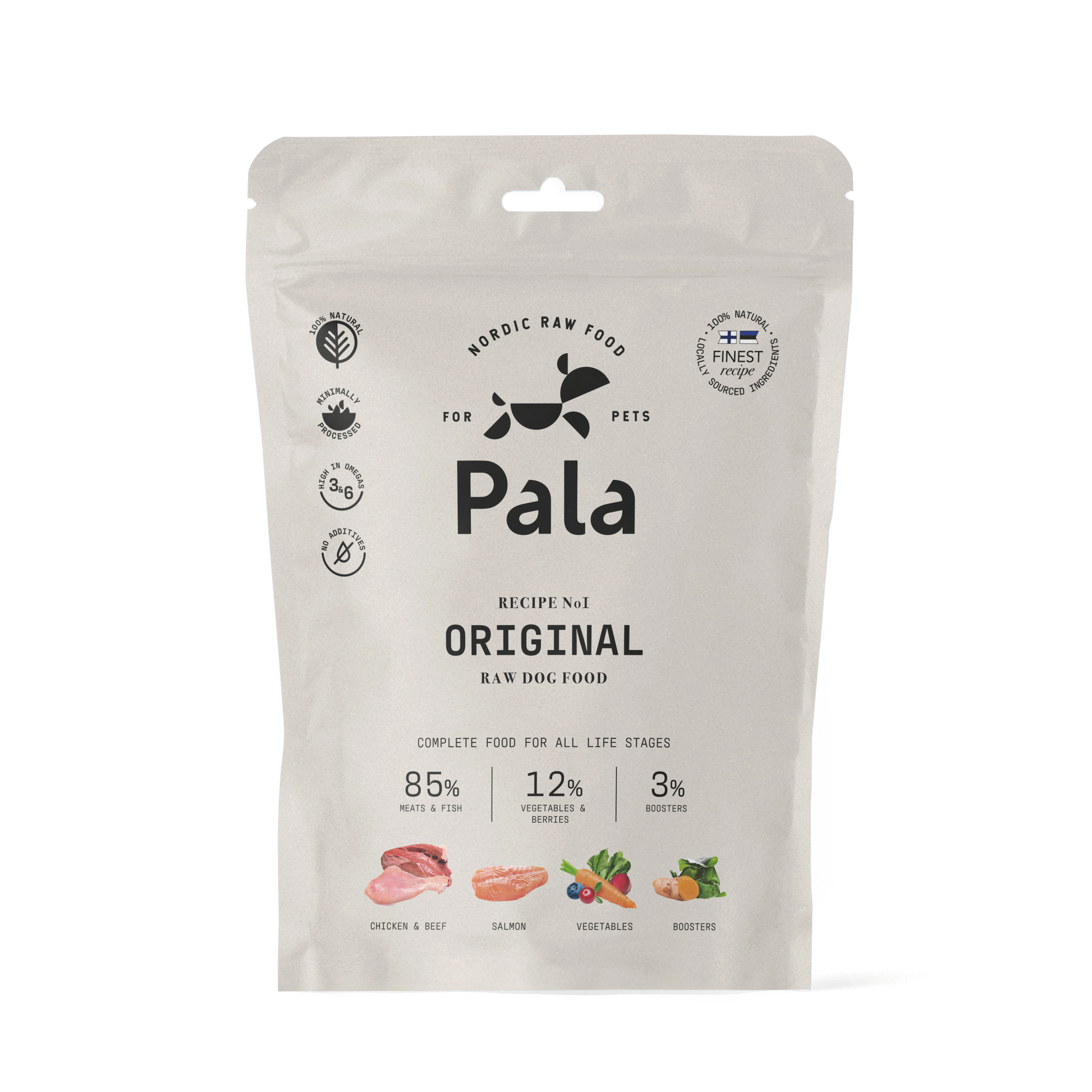 Pala – Air Dried Original är ett lufttorkat helfoder baserat på kyckling, nötkött och lax. Receptet innehåller 41% kyckling, 32% nötkött och 12% lax, kompletterat med grönsaker, bär och naturliga råvaror som kelp, krabbskal och örter. Kombinationen av muskelkött, organ, vom, ben och hel lax ger en naturligt näringstät måltid med hög andel animaliskt innehåll.