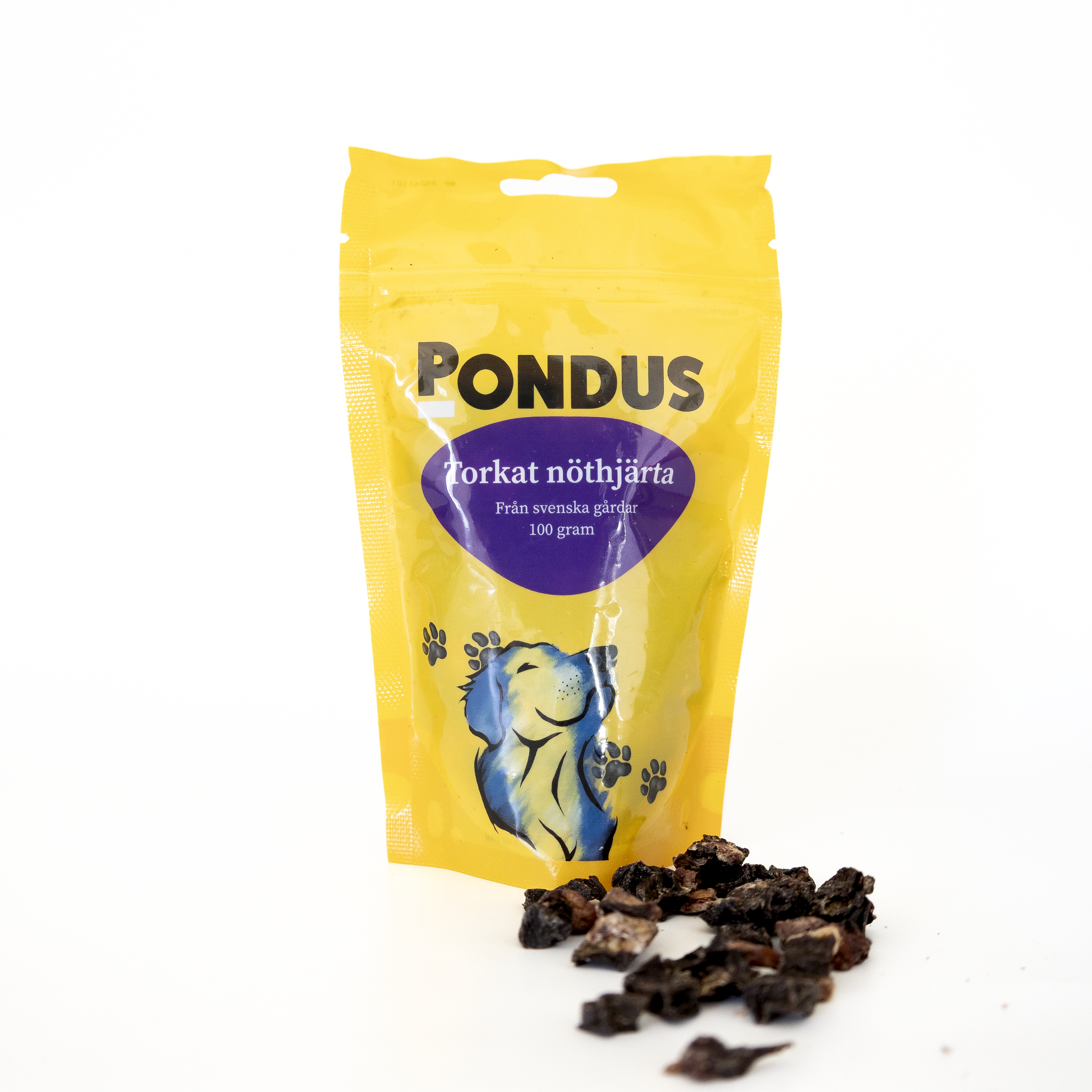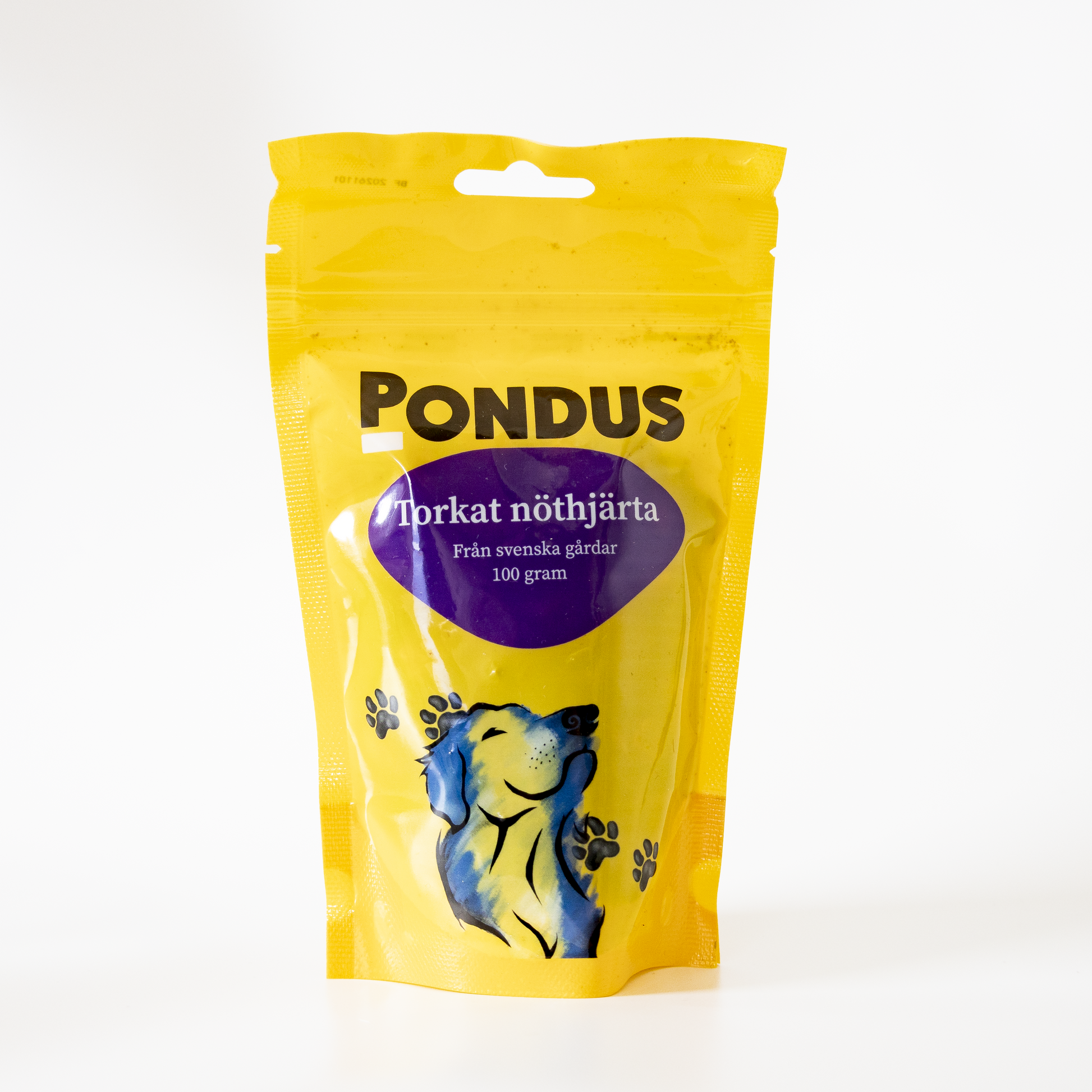 Pondus torkade nöthjärta är ett naturligt och proteinrikt hundgodis med en härligt krispig konsistens. Bitarna varierar i storlek, från cirka 0.5x0.5 cm upp till 1.5x1.5 cm - vissa går att bryta för hand, medan andra är lite mer motståndskraftiga. Perfekt att använda vid träning eller som en smakrik belöning i vardagen.