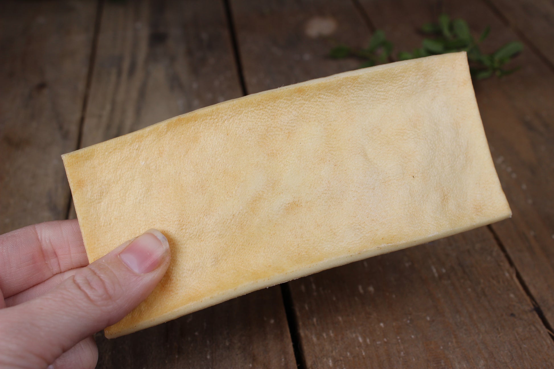 Tugget har ett fast motstånd som sysselsätter hunden en stund, men eftersom det är ett platt stycke hud håller det inte lika länge som en klassisk tuggrulle.