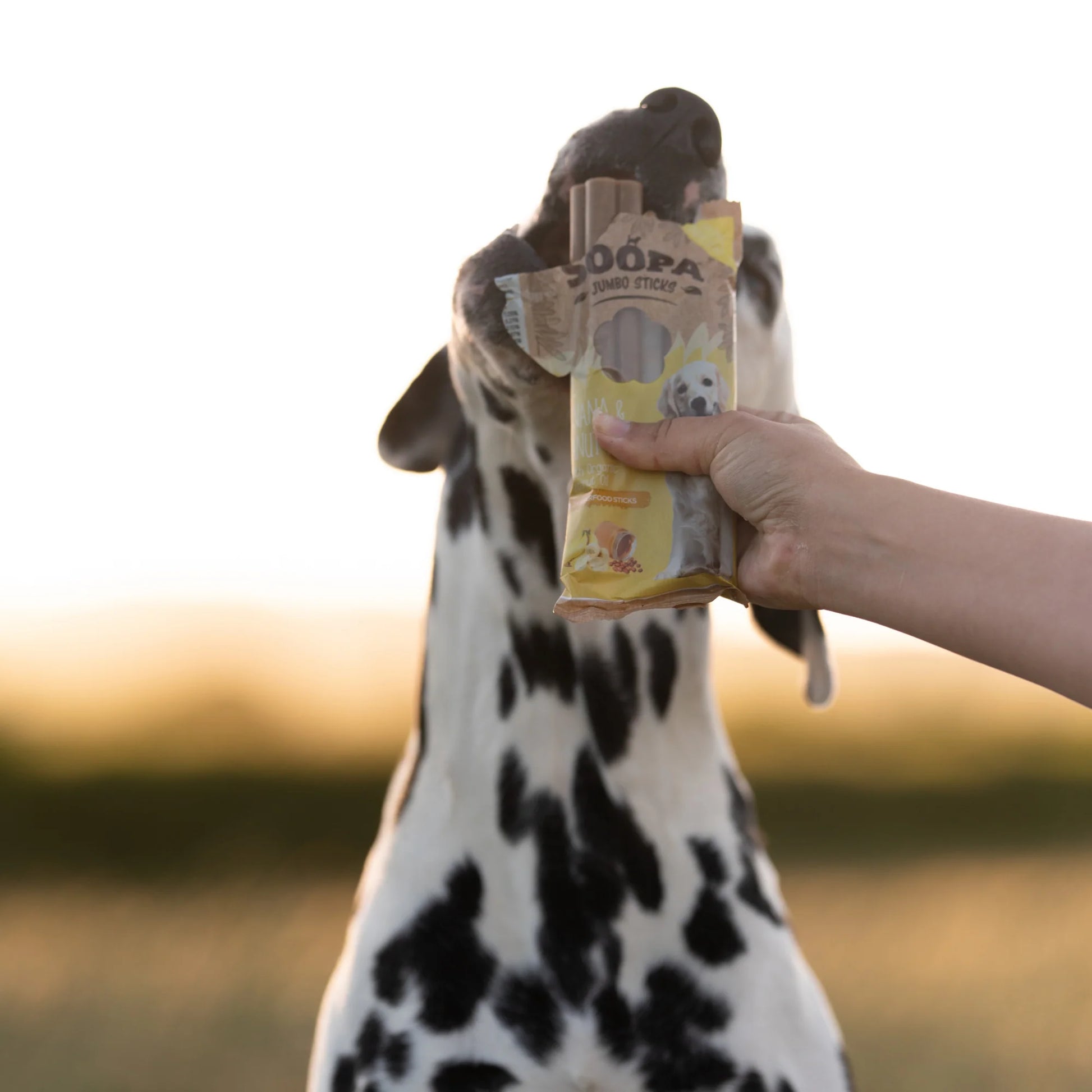 Soopa Jumbo Sticks med banan och jordnötssmör är ett naturligt, veganskt mellanmål för större hundar som gillar att tugga lite längre. De är tillverkade av ingredienser av livsmedelskvalitet, fria från spannmål och med låg fetthalt - ett smart alternativ för hundar med känslig mage eller vikt att hålla koll på.